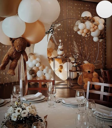 Desenvolvemos uma decoração elegante e acolhedora com tons suaves, iluminação ambiente, balões personalizados e detalhes delicados. Um cenário perfeito para celebrar um momento único em família.