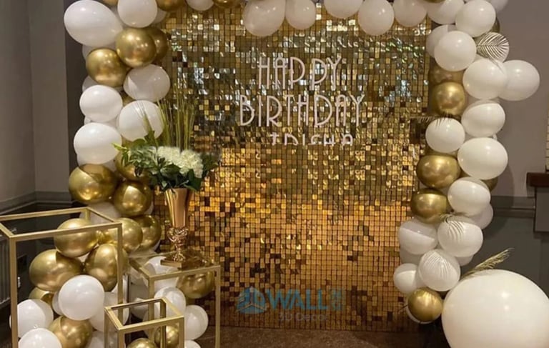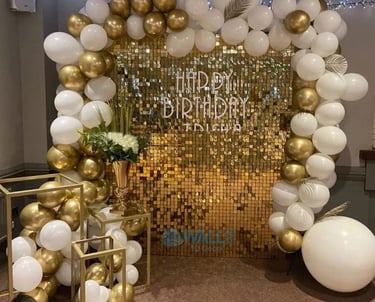 Criámos um ambiente sofisticado e cheio de brilho com painel premium, balões em tons dourado e branco e detalhes requintados. A escolha perfeita para celebrar momentos especiais com estilo e glamour.